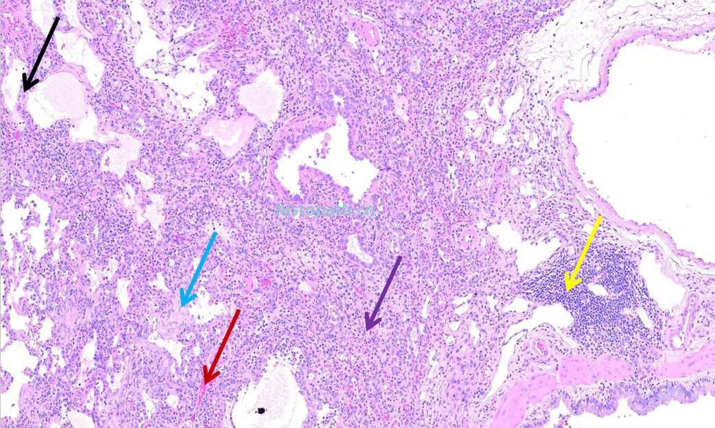 结果分析:HE染色可见肺组织炎症性改变:肺泡隔增厚(黑色箭头),局部肺组织结构破坏(紫色箭头),血管扩张充血(红色箭头),间质纤维组织增生(蓝色箭头),伴大量炎性细胞浸润(黄色箭头)。