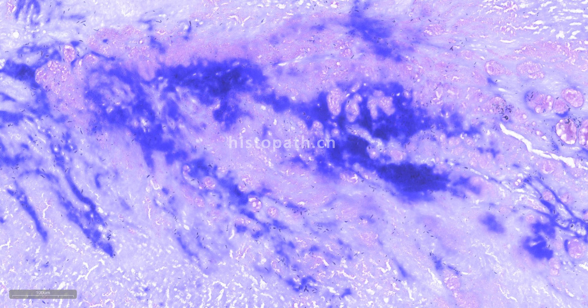 4、 脱色:滴加脱色液从载玻片一端冲洗组织进行脱色,直至流下的脱色液不再出现紫色为止,立即水洗去除脱色液。注意控制脱色时间。