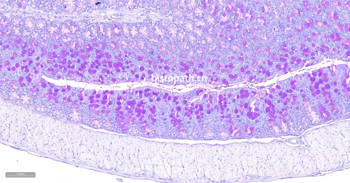 糖原是由D-葡萄糖的分支或直链组成的高分子多糖类化合物,糖原的合成与分解代谢主要发生在肝、肾和肌肉组织中。过碘酸是一种强氧化剂,能将组织或者细胞中的糖原及有关物质中的1,2-乙二醇基(CHOH-CHOH)氧化成两个游离醛基(- CHO),且过碘酸的特点是不再继续将醛基氧化成羧基。Schiff试剂(Schiff reagent),又称品红亚硫酸试剂,含碱性品红和亚硫酸,碱性品红与亚硫酸结合后,失去醌式结构而生成无色品红。无色品红与过碘酸氧化的游离醛基结合,醌式结构恢复,生成洋红色(magenta)产物,定位于胞浆,颜色没深浅与多糖含量成正比。