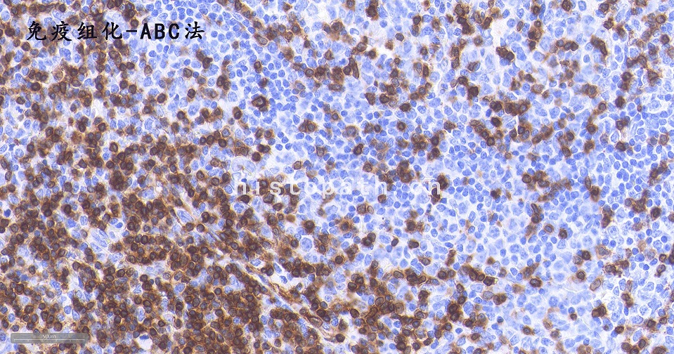 8, 显色:DAB显色液,配置DAB:1mlB液+1滴A液混匀,滴加DAB显色液,镜下观察至阳性明显增强、背景干净终止显色;如果显色淡,可重复上一步增强显示色。