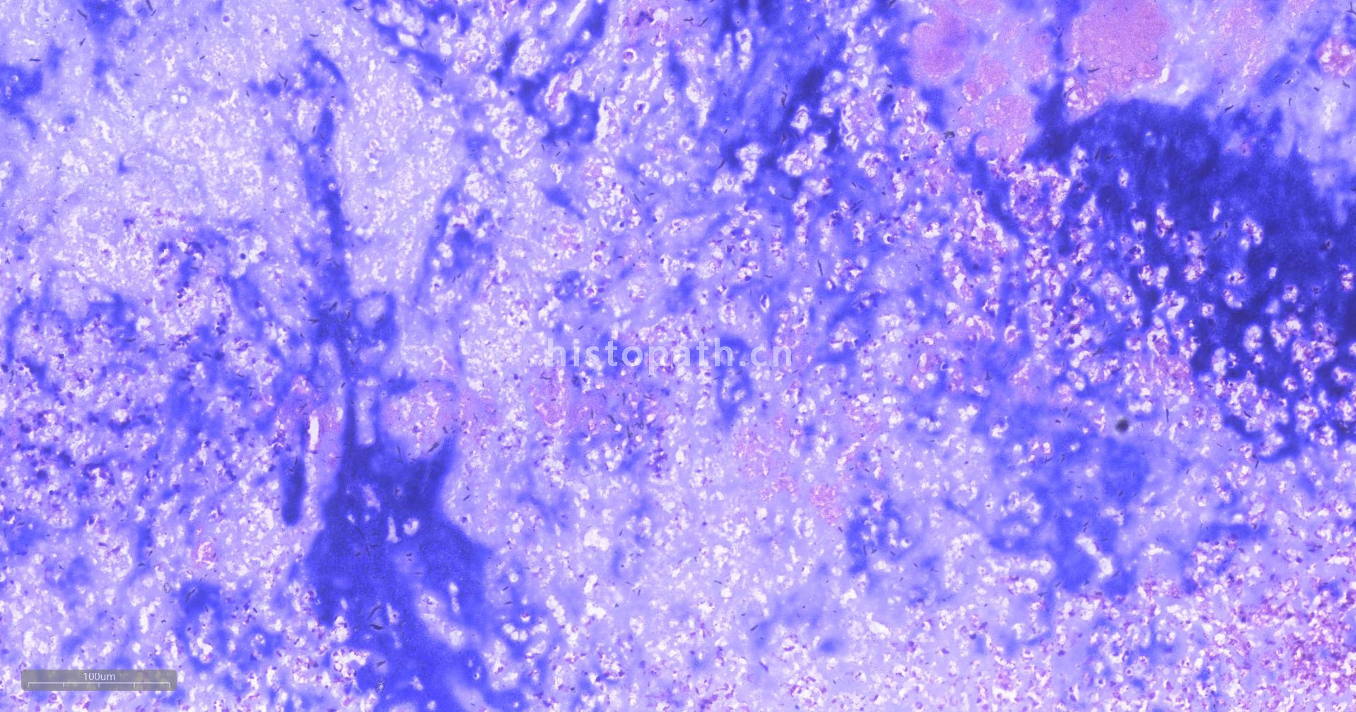 4、 脱色:滴加脱色液从载玻片一端冲洗组织进行脱色,直至流下的脱色液不再出现紫色为止,立即水洗去除脱色液。注意控制脱色时间。