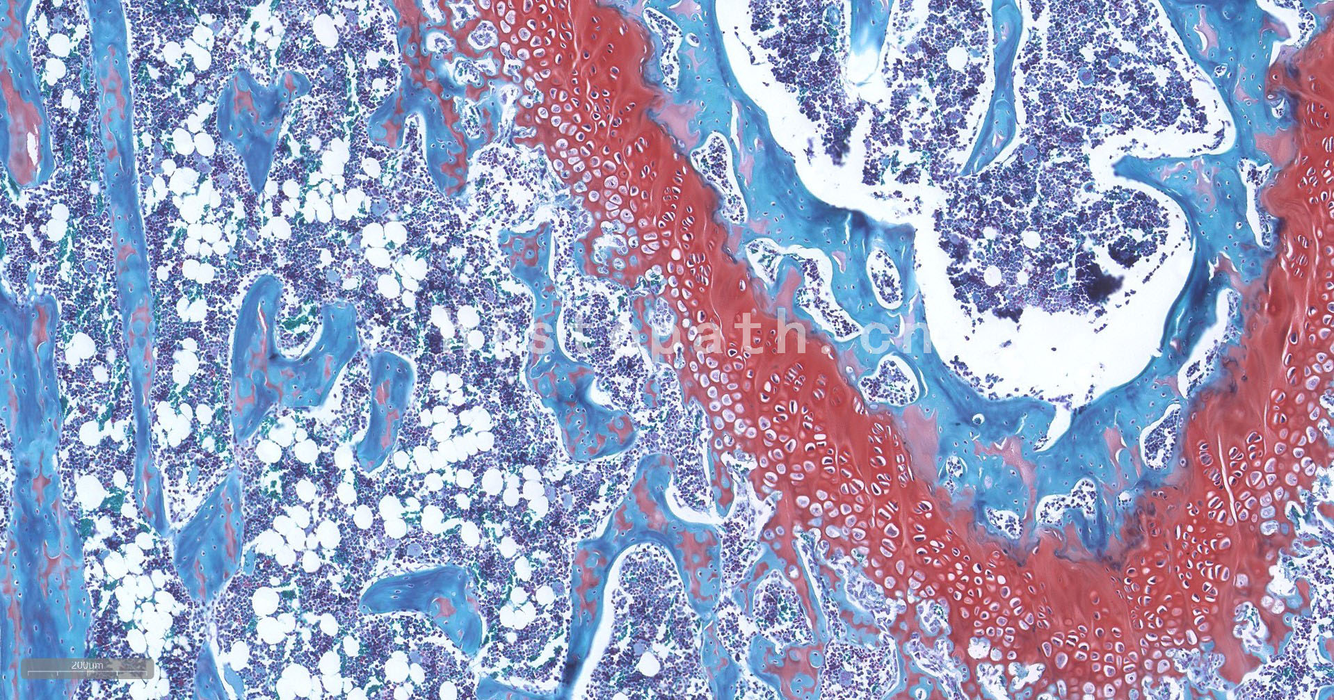改良番红 O-固绿软骨染色法的染色原理在于嗜碱性的软骨与碱性染料番红 O结合呈现红色,嗜酸性的骨和酸性染料固绿结合而成绿色或蓝色,与呈现红色的软骨对比鲜明,从而将软骨组织和骨组织区分开。番红 O着色与阴离子的浓度近似成正比关系,间接反映了基质中蛋白多糖的含量和分布。当软骨受到损伤时,软骨中的糖蛋白会释放出来,使基质成分分布不均匀,从而导致番红 O淡染或不着色。通过图像分析软件可对番红 O染色的软骨基质进行定量分析。同固绿与胶原纤维结合,不易褪色。番红 O-固绿染色的分化很关键,分化过度易导致切片不着色,分化不足易导致切片着色过深。