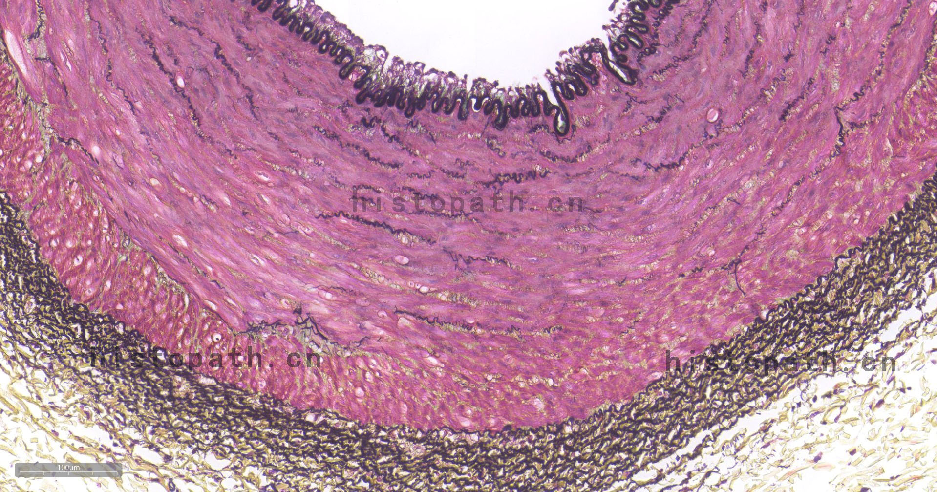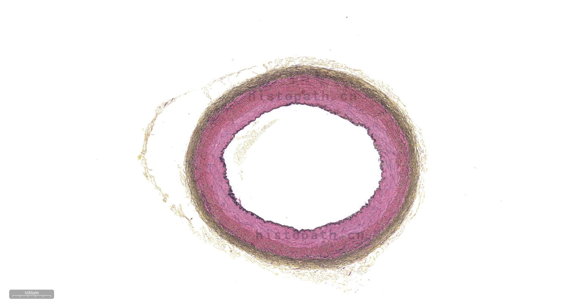 结缔组织狭义上是指其含有的三种纤维:胶原纤维、网状纤维、弹力纤维。结缔组织染色方法亦有很多种,如Masson三色染色法、Van Gieson染色法、Gomori氨银法、Mallory磷钨酸苏木素染色,然而以上染色方法只是侧重于某一两种组织的染色。Russell改良Movat五色套染以其染色丰富、呈色鲜艳而大受欢迎。该染色法常用于显示动脉粥样硬化斑块。苏木素用于染细胞核和弹力纤维,品红用于染细胞质和肌肉纤维,藏红花染胶原组织,阿利新蓝染基质(蛋白聚糖)。